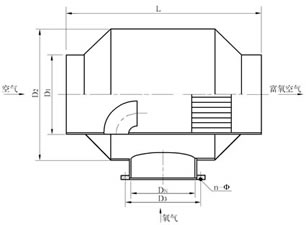 本产品由内、外筒体,导流筒和混合单元组成(见下图)。氧气进入两筒体之间的空间后经导流筒引入空气流中实现初混,然后进入混合单元,被多次切割分流,从管尾出来的已经是均匀混合的富氧空气。